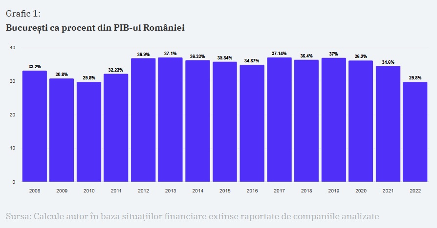 Nu trebuie să ai multă școală ori acces la date financiare avansate pentru a realiza că Bucureștiul și marile orașe din România s-au dezvoltat într-un ritm diferit comparativ cu restul țării. În acest context, devine absurd să credem cifrele publicate recent de Comisia Națională de Strategie și Prognoză în cea mai recentă ediție din acest an a „Prognozei în profil teritorial 2022–2026” care indică o pondere stabilă a capitalei la formarea întregului PIB național în perioada 2017–2022 la circa 24–25%, nivel similar cu tot ceea ce se raportează pentru ultimul deceniu.