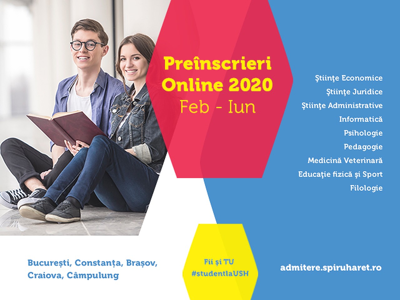 Universitatea Spiru Haret desfășoară până la data de 30 iunie campania de preînscrieri online la cele 42 programe de Licenţă şi 31 programe de Masterat în cele cinci centre universitare din Bucureşti, Constanţa, Braşov, Câmpulung şi Craiova. Candidații care se preînscriu on-line pe site-ul www.admitere.spiruharet.ro vor fi scutiți de plata taxei de admitere.