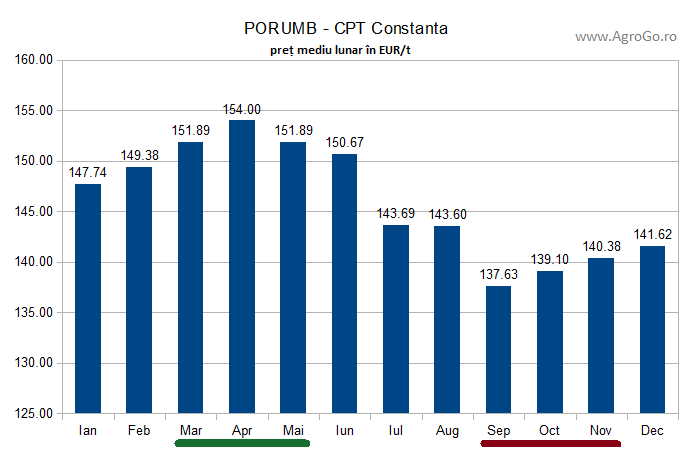 La porumb lucrurile stau altfel. Aici vorbim de stocuri mari, dat fiind faptul că anul trecut am avut o producție de aprox. 17 mil. tone porumb, iar România este cel mai mare producător și exportator de porumb din UE. Ce vom face cu aceste stocuri dacă exportul nu este permis? Nu putem schimba peste noapte capacitatea de procesare de cereale. În plus, dacă analizăm prețurile din portul Constanța din ultimii ani, vedem că aceasta era cea mai bună perioadă pentru vânzare de porumb (vezi graficul de mai jos cu prețuri medii din ultimii 3 ani).