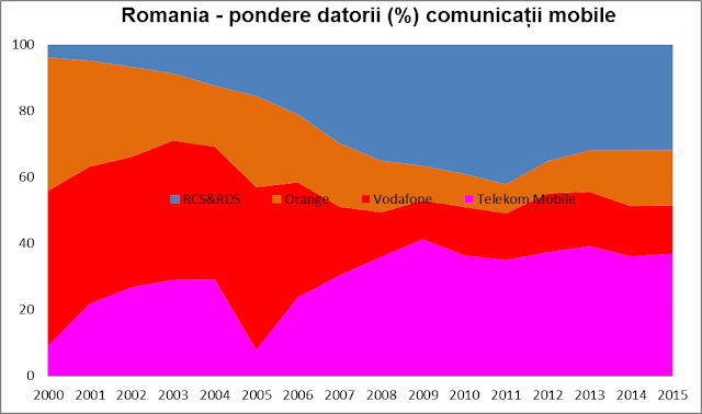 Acesta se poate observa și din graficul de mai jos unde se vede că ponderea împrumuturilor operatorilor Orange și Vodafone în total împrumuturi telefonie mobilă a fost mai mare în primii ani, 40%, respectiv 47%, reducându-se mult în ultimii ani, astfel că în anul 2015 datorile Orange reprezentau 16,7% din totalul datoriilor, respectiv 14,6% la Vodafone, fapt ce denotă afaceri eficiente, stabile. Prin contrast, datoriile Telekom Mobile și RCS&RDS la finele anului 2015 au reprezentat 36,9%, respectiv 31,8% din totalul datoriilor, cu mențiunea că datroriile RCS&RDS au fost făcute pentru rețele fixe și mobile.
