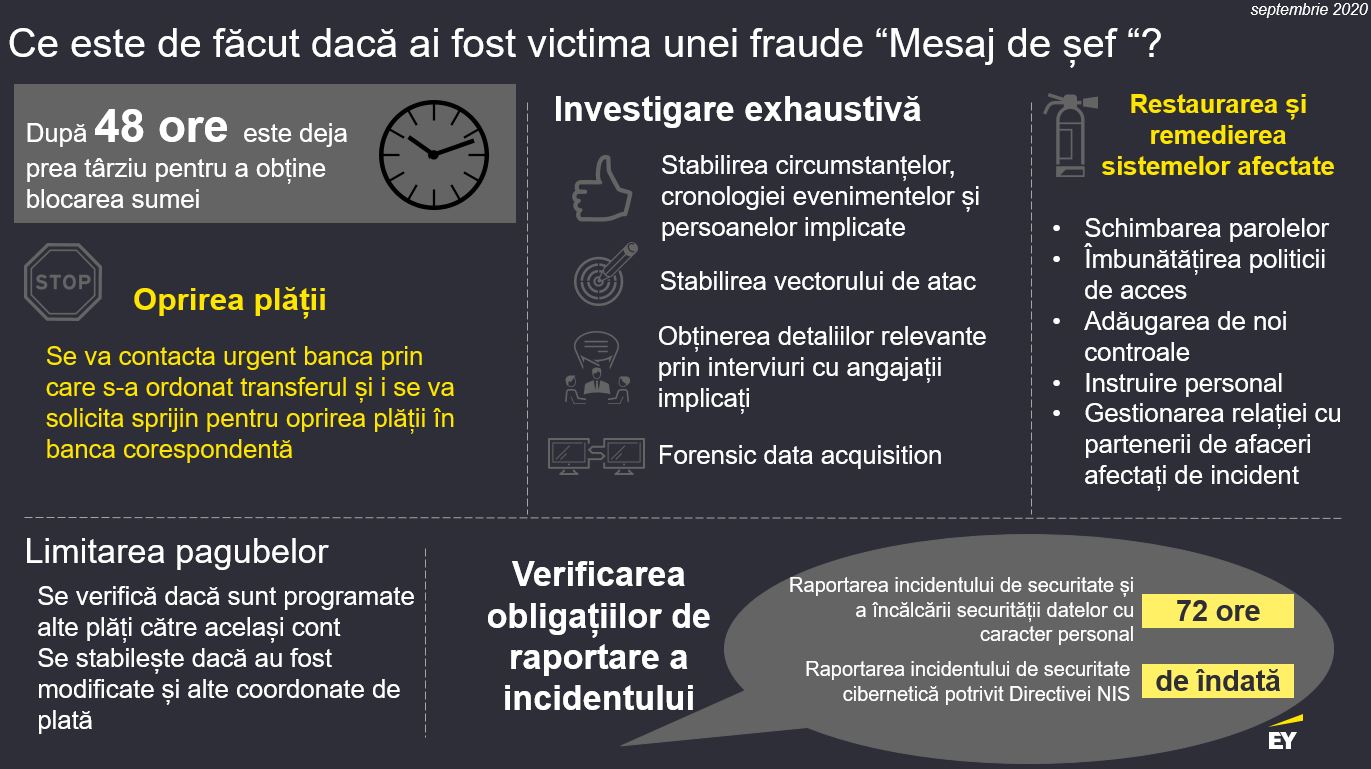 Nu în ultimul rând, deși de cele mai multe ori există o reținere în acest sens, se recomandă formularea unei plângeri penale. Chiar dacă probabilitatea de recuperare a sumelor transferate nu este foarte mare, un astfel de demers legal va avea un efect de descurajare pe termen lung a autorilor unei astfel de fraude.