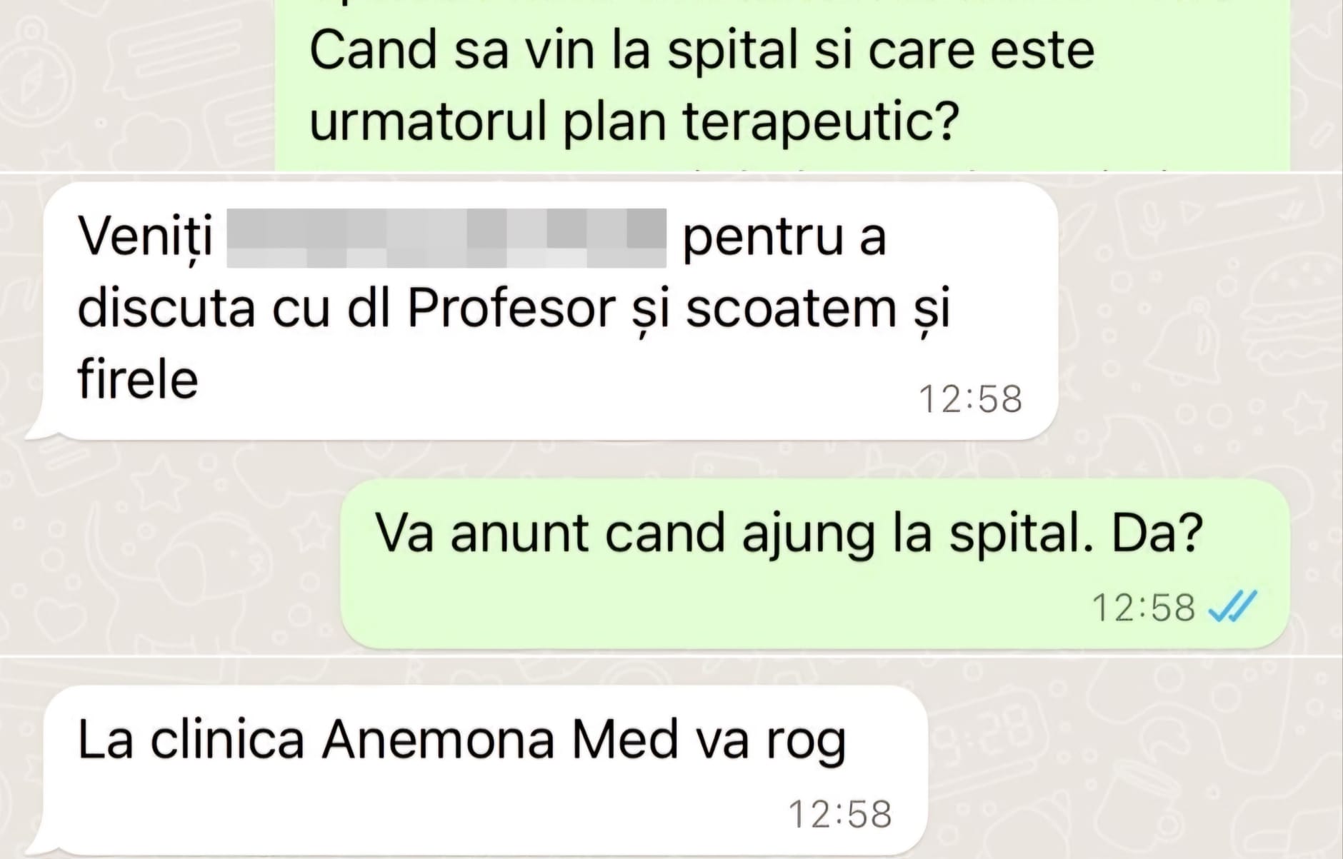 „Mesajele în care medicul îmi spunea să merg la Anemona au fost în martie 2022 și iunie 2022. Dr. Cîrstoiu arată un mesaj de mai târziu, din august 2022, când mi-au propus să mă opereze a doua oară, la stat, căci prima operație nu mergea bine”.