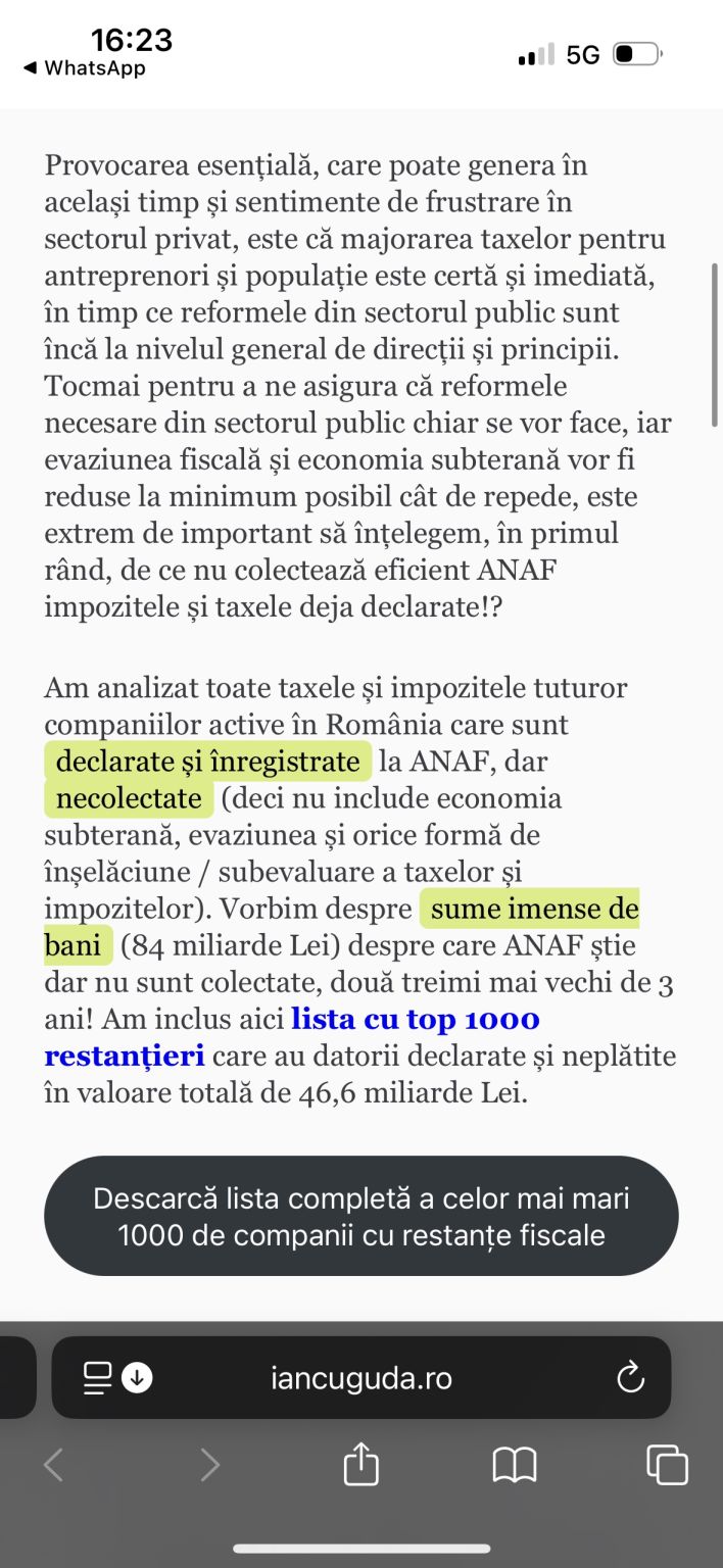 Am fost sfatuit sa nu o fac … dar, am promis, ma tin de cuvant. Nu incalc nicio lege, datele sunt publice, doar ca este foarte greu sa le gestionezi structurat si sa ai imaginea de ansamblu. Eu am acces la date si sisteme, ceea ce vine cu responsabilitatea sa fac ceva. Iata care sunt cei mai mari 1.000 de contribuabili restantieri la ANAF, care datoreaza 46.6 miliarde RON (de 4 ori mai mult decat impactul maximal al cresterii TVA). Poti descarca GRATUIT lista din articolul publicat pe blogul meu (vezi link in primul comentariu 👇). De ce sa sufere toata Romania din cauza celor 1.000 de smecheri ??? 🤨 Hotii nu se joaca, cea mai mica restanta din top 1000 este de 10 milioane RON. Distribuiti, va rog 🙏 Sa facem cunoscute publicului larg problemele, solutiile si, mai ales, cele 1000 de companii care nu isi platesc taxele si impozitele 👇