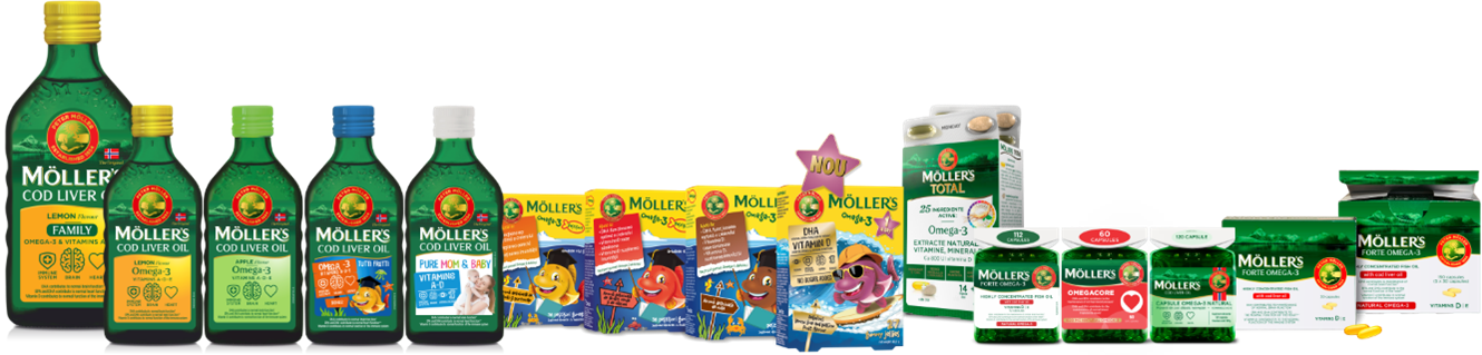 Brandul Möller’s are în portofoliu o gamă variată de produse pentru toate vârstele, sub formă de ulei de ficat de cod, peștișori gumați, capsule moi sau multivitamine.