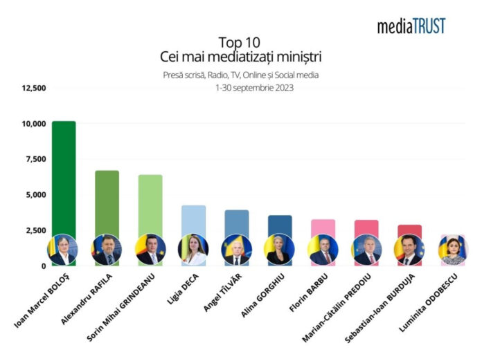 Ioan Marcel BOLOŞ – Cel mai mediatizat ministru în septembrie. Alexandru RAFILA pe poziția a doua, iar Sorin Mihai GRINDEANU închide podiumul.